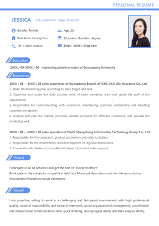 蓝色销售主管中英文简历