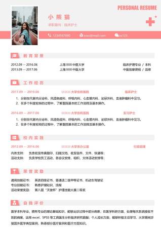 护理专业应届生个人简历医学生RESUME护士个人求职CV
