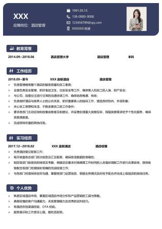 商务蓝色酒店管理酒店经理主管简历