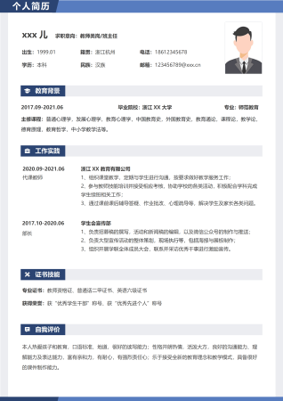 蓝色时尚幼儿教师3年工作经验简历word模板